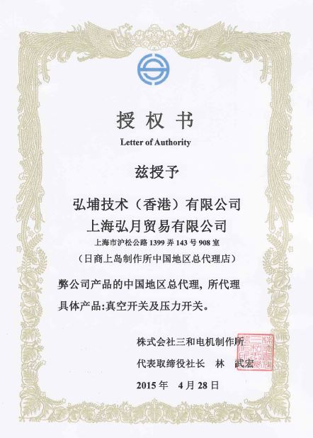 以下是三和電機(jī)制作所授權(quán)我司的代理證書。